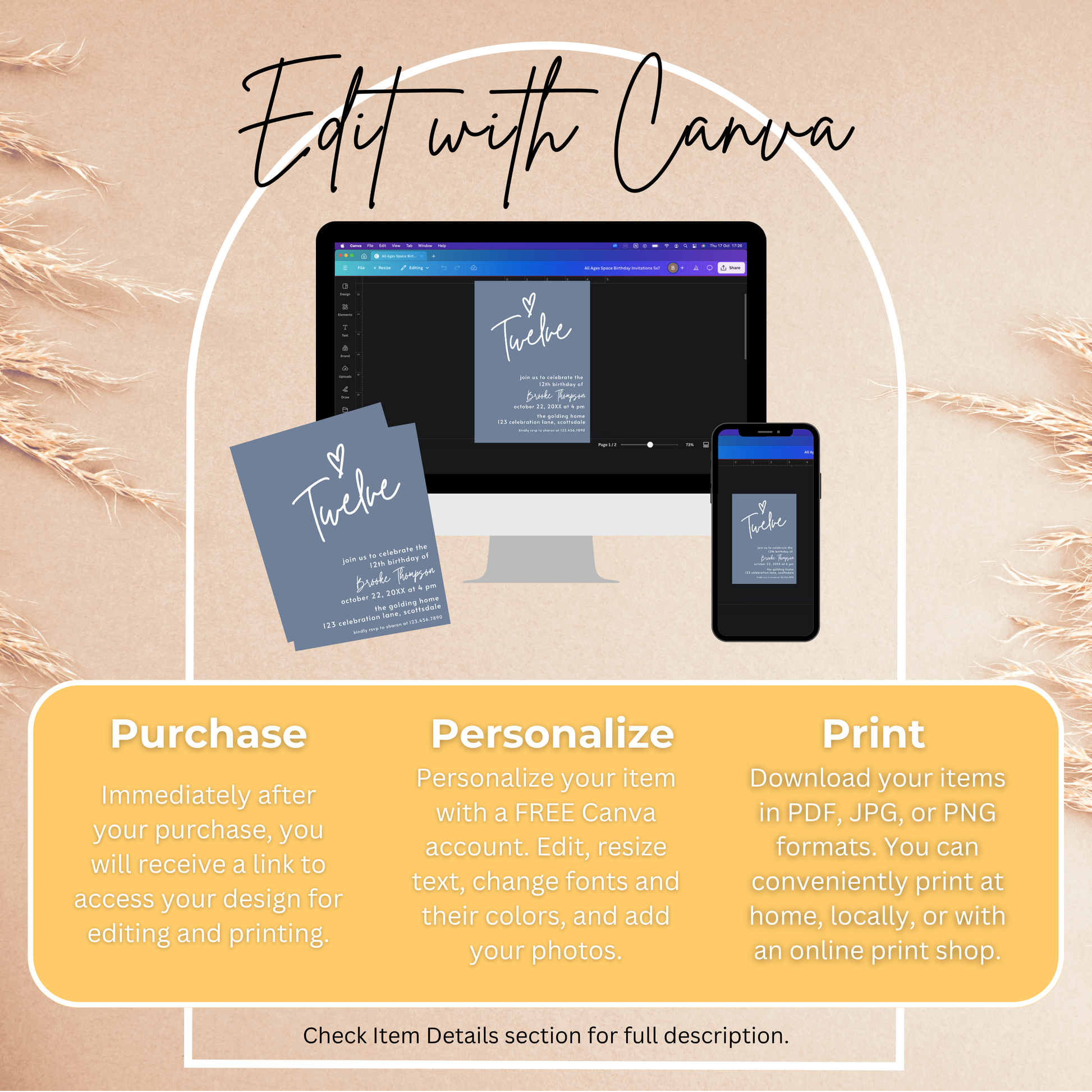 You will receive a PDF with a link to edit your digital design, no printed items will be shipped!
