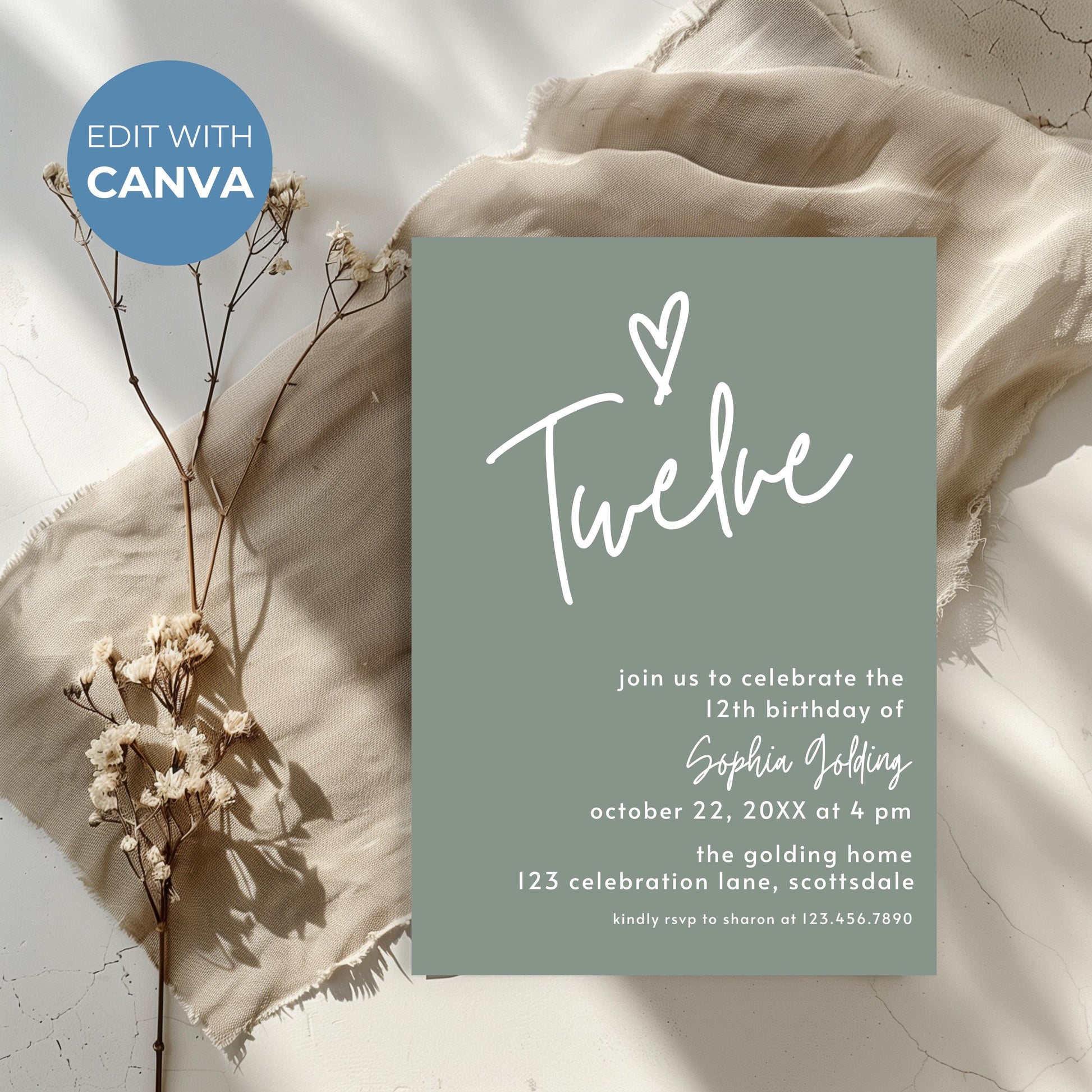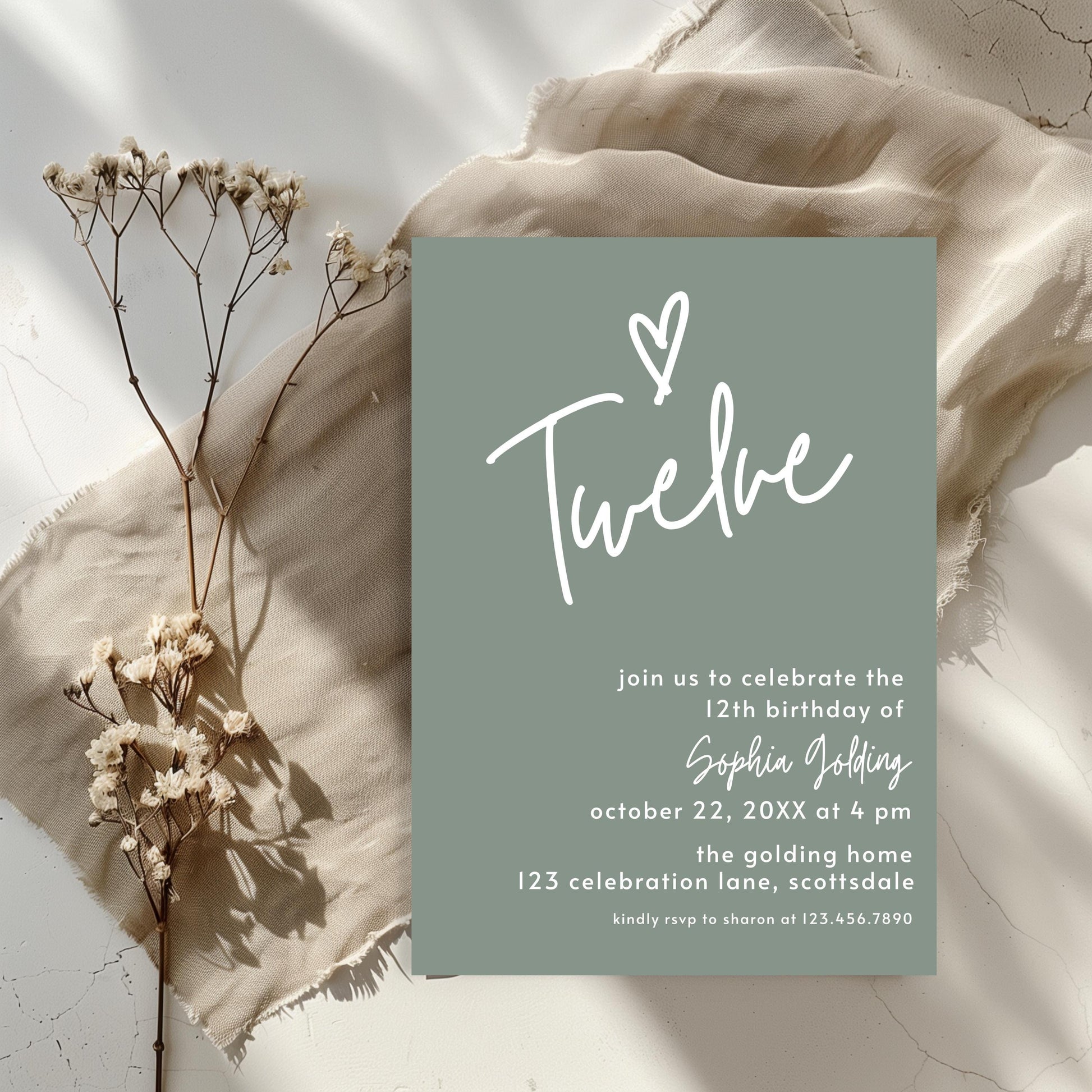 12th Birthday Invitation for Girl Sage Green Twelfth Birthday Invite for Teenager Simple Elegant Invitation Printable Template Modern 0003