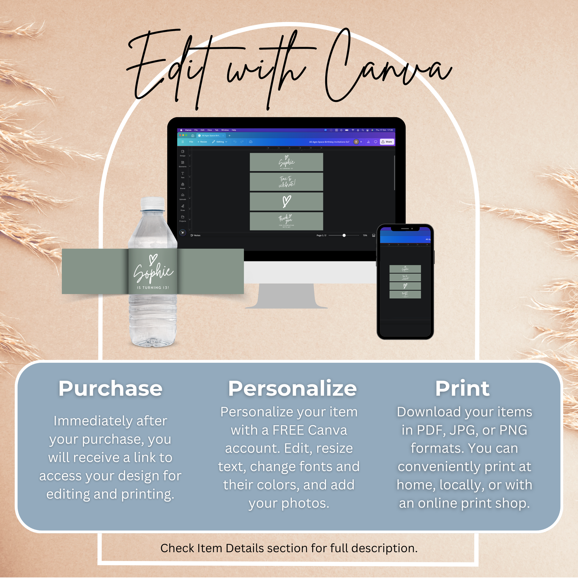 13th Birthday Sage Green Water Bottle Labels Printable Girl Party Favor Sage Green Thirteenth Birthday Teen Girl Minimalist Decoration 0003