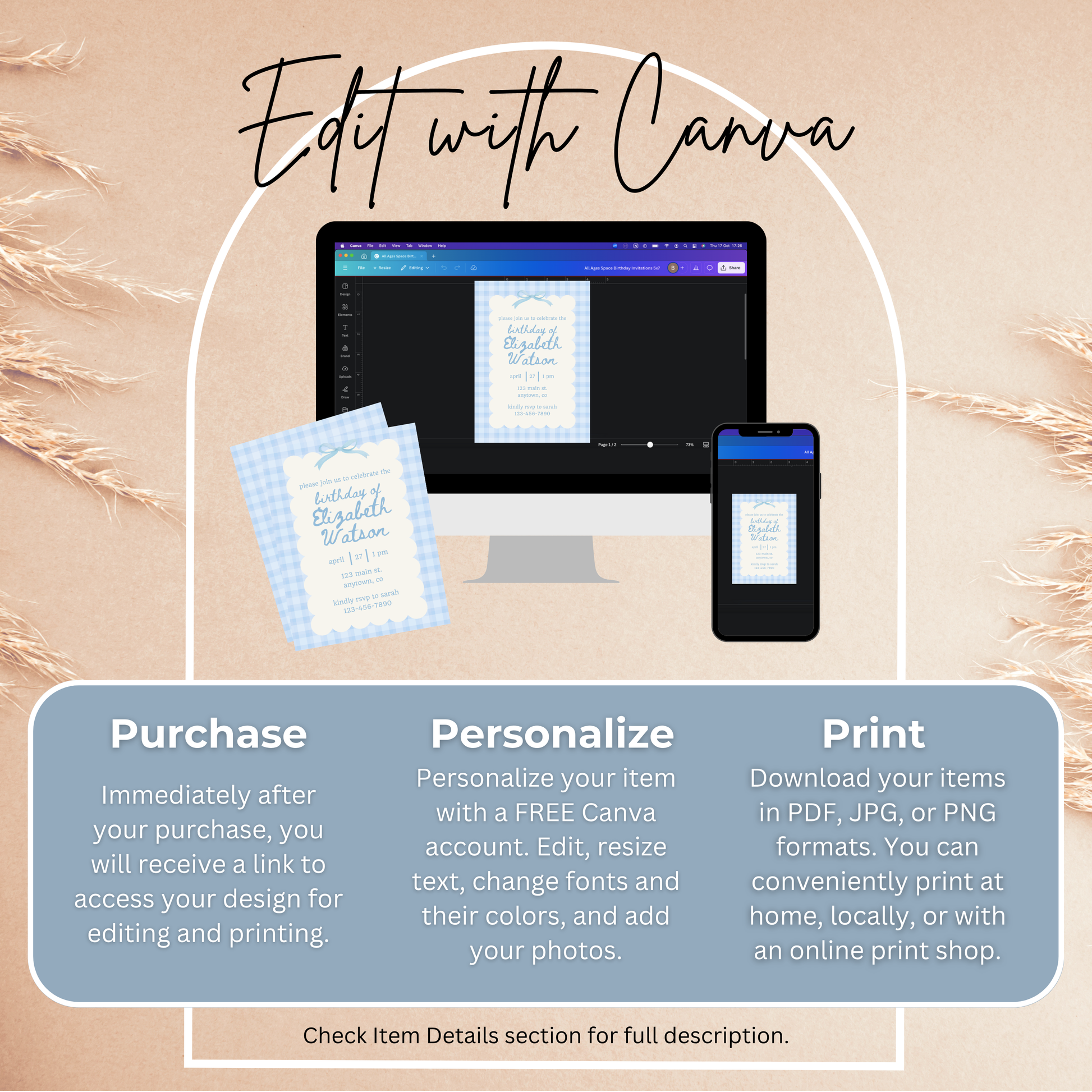 You will receive a PDF with a link to edit your digital design, no printed items will be shipped!