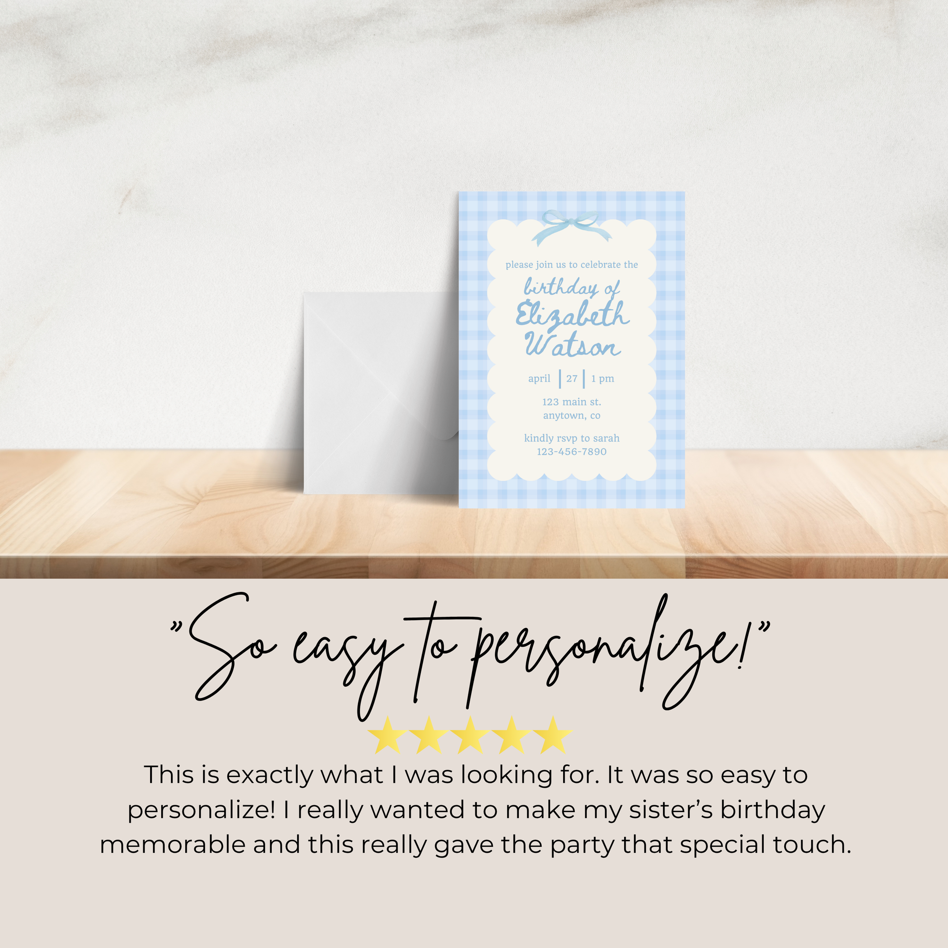 Blue Gingham Invitation for Women Birthday Party Dusty Blue Gingham Invite Scalloped Edge Modern Invitation Trendy Birthday Invite 0012