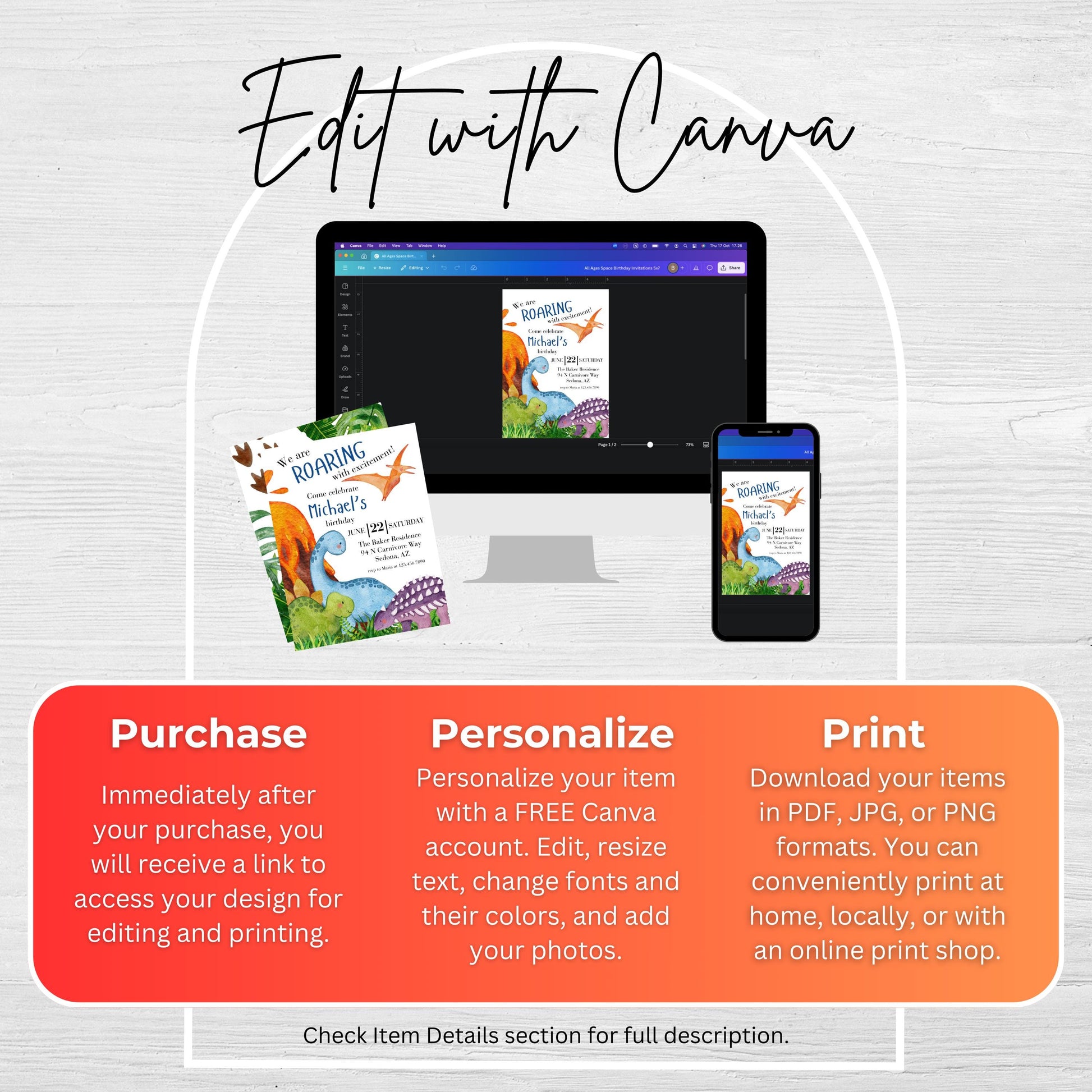 You will receive a PDF with a link to edit your digital design, no printed items will be shipped!