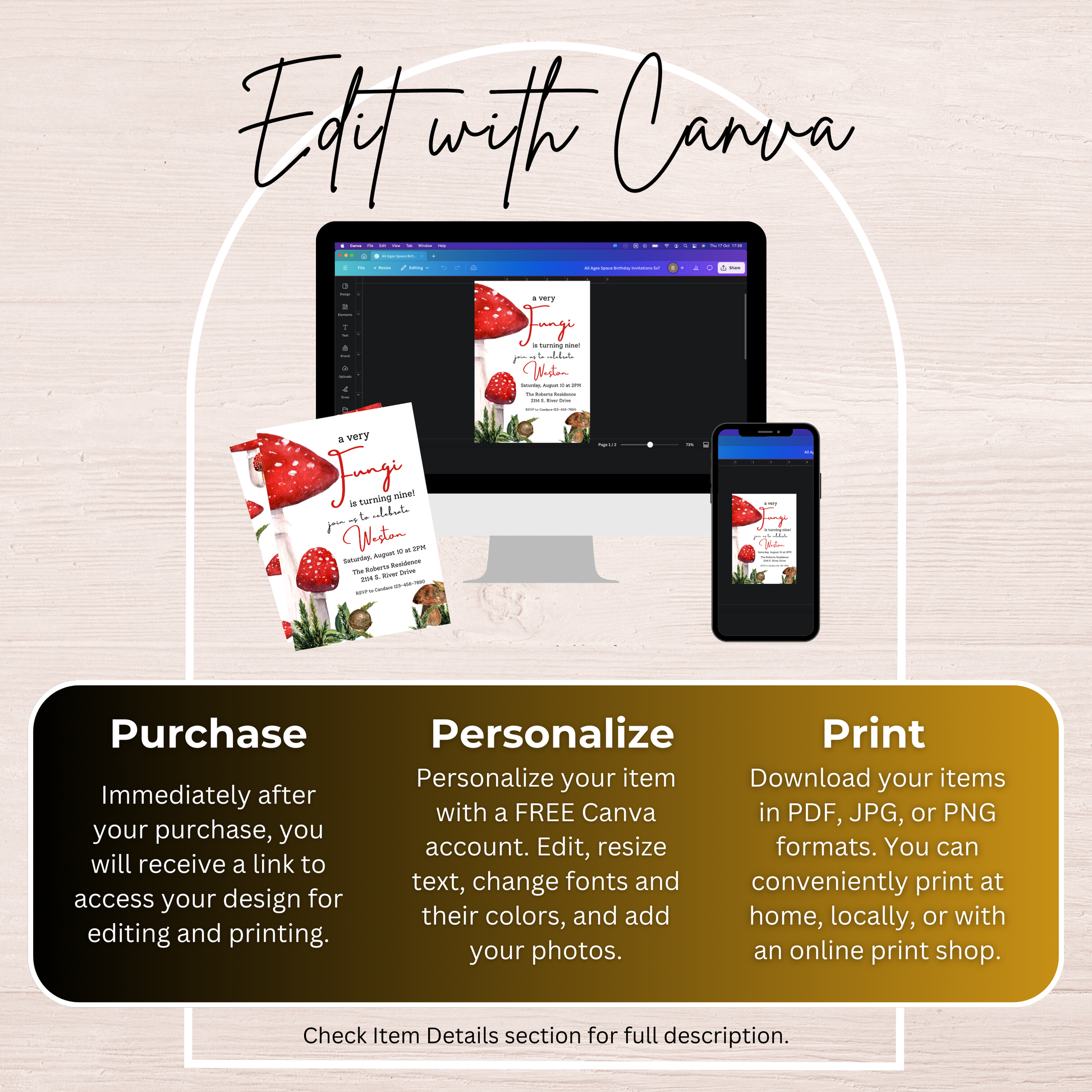 Mushroom 9th Birthday Invitation Template: Fungi Invite Digital Download 0004