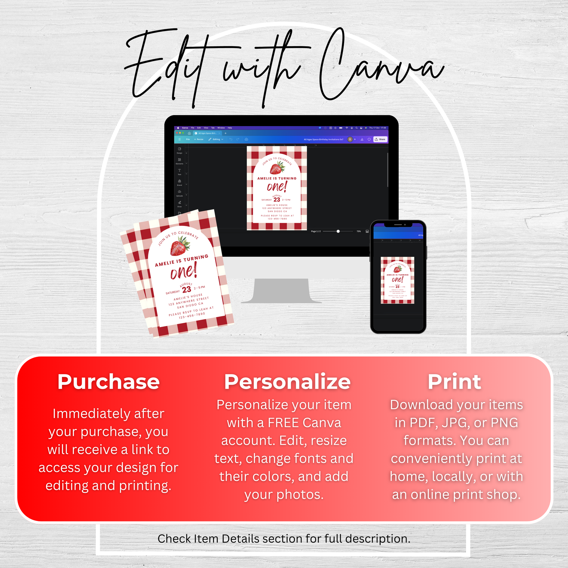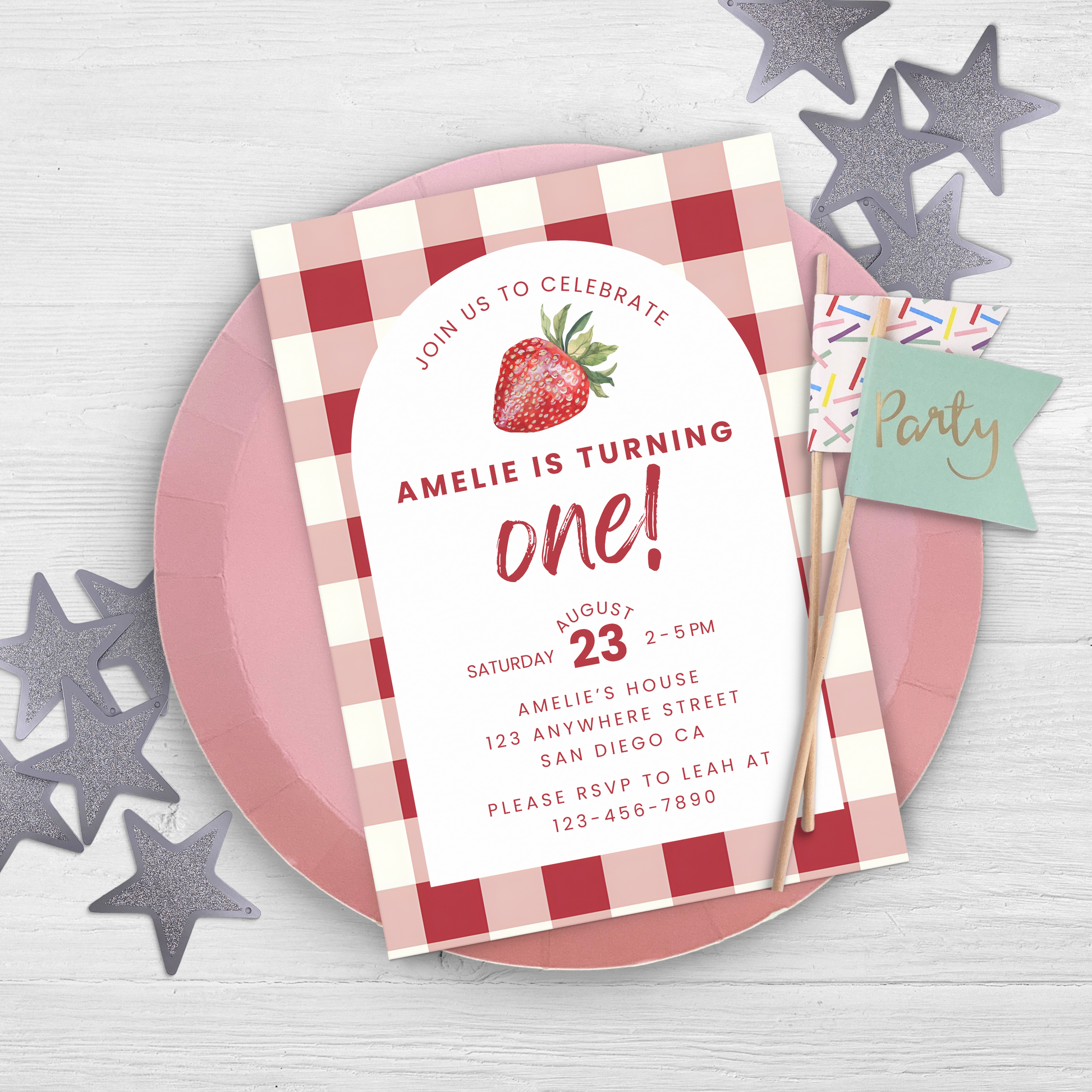 Strawberry Birthday Invitation: First Birthday Girl Editable Printable Invite